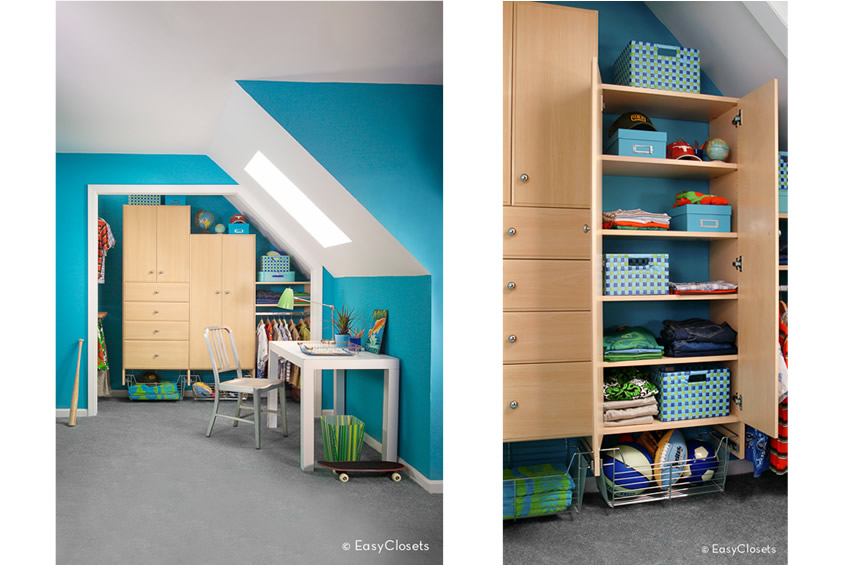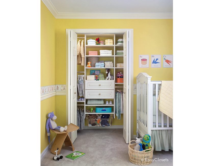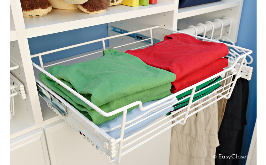 You should look at the closet from your child’s perspective. Most closet bars and shelves are at an adult height, which makes it difficult for your child to put things away on their own. You may want to consider lowering the bar, adding a second bar, or even adding additional child-height shelves. Bars and shelves can easily be adjusted as your child grows. With a few minor changes to the closet, your child will not have an excuse for not hanging up their clothes.