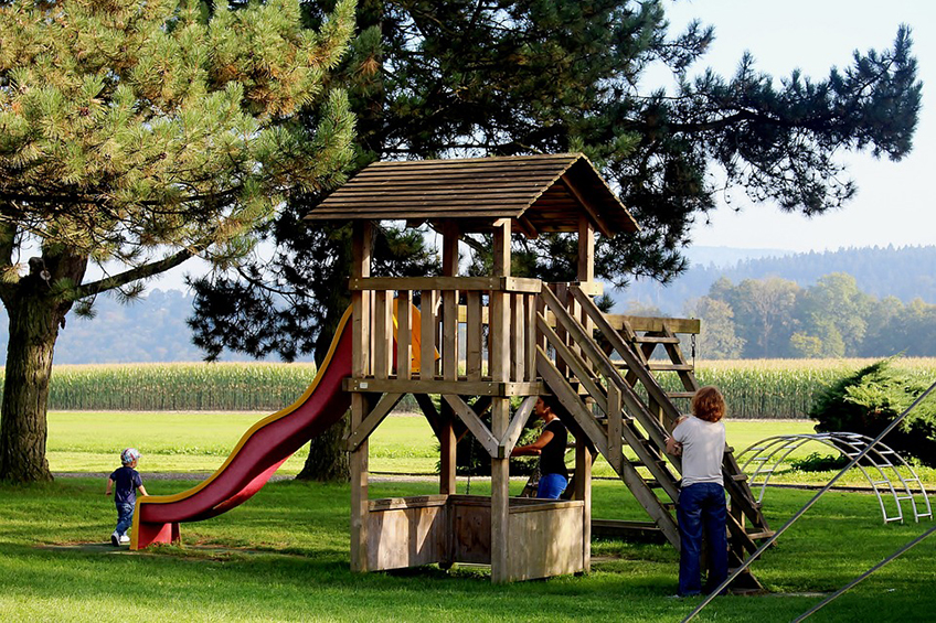 The platforms of slides and climbing structures should have secure railings to protect kids from falling. Also, look for tripping hazards such as tree roots, loose stepping stones or rocks that have shifted out of place.