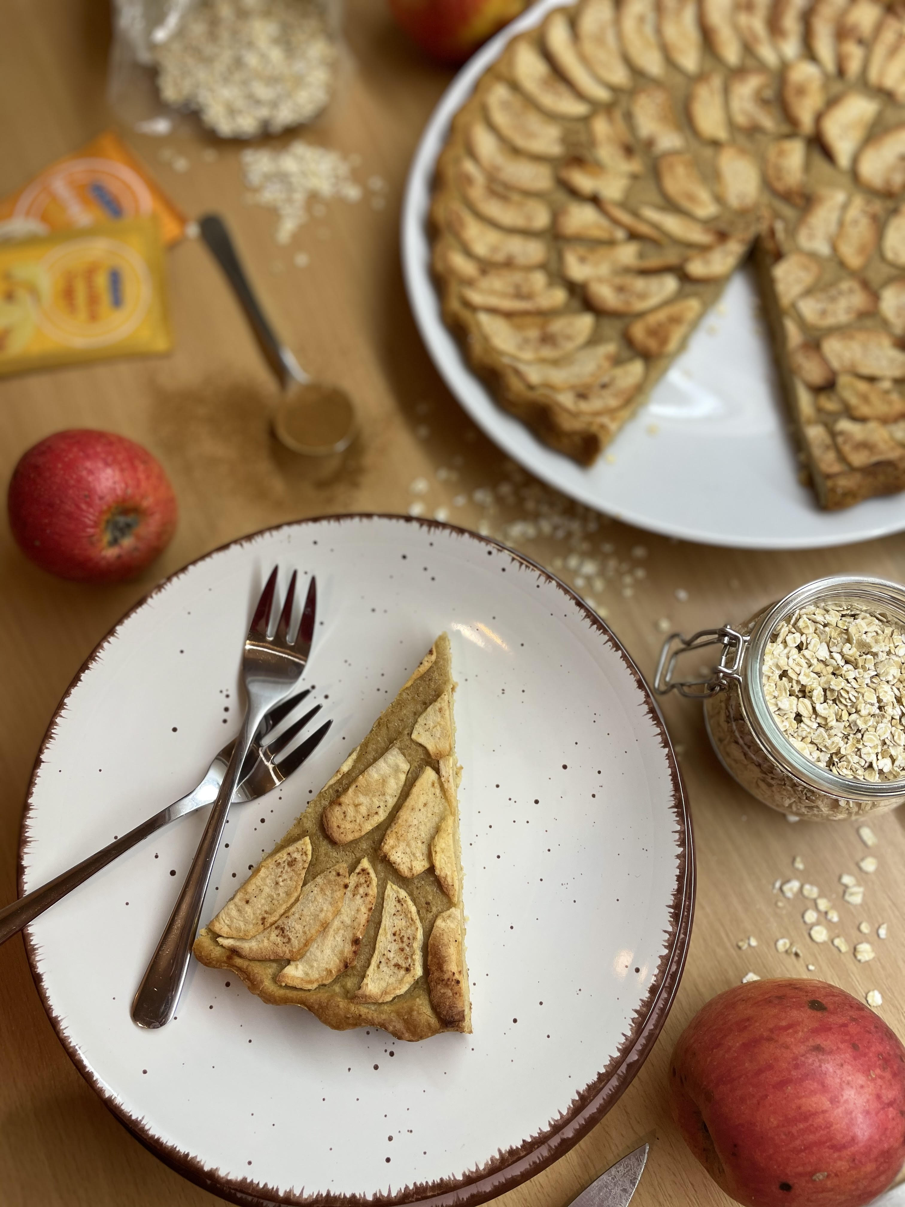 Jablka omyjeme a rozmixujeme v mixéru. Přidáme ovesné vločky, vanilkový cukr, prášek do pečiva, rozpuštěné máslo a vodu. Vody dodáme tolik, aby bylo možné jednotlivé ingredience dokonale rozmělnit. Získat bychom měli krásně hladkou směs. Dvě jablka oloupeme, nakrájíme na tenké plátky a naskládáme do kruhu. Podle vlastní chuti je můžeme posypat trochou skořice. Směs pečeme přibližně 30 minut v troubě předehřáté na 220 stupňů. Moučník podáváme s ovocným kompotem. Nejlepší bude kompot z meruněk nebo broskví, které mohou děti konzumovat již po 6. měsíci života.
