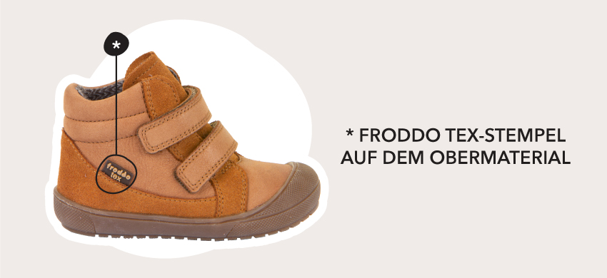 Die Erkennung von wasserdichten Froddo-Schuhen ist einfach. Suchen Sie nach dem Froddo TEX Label auf dem Obermaterial des Schuhs (siehe Bild zur Referenz). Dieses Zeichen garantiert, dass die Schuhe die zuverlässige PU-Membrantechnologie enthalten.