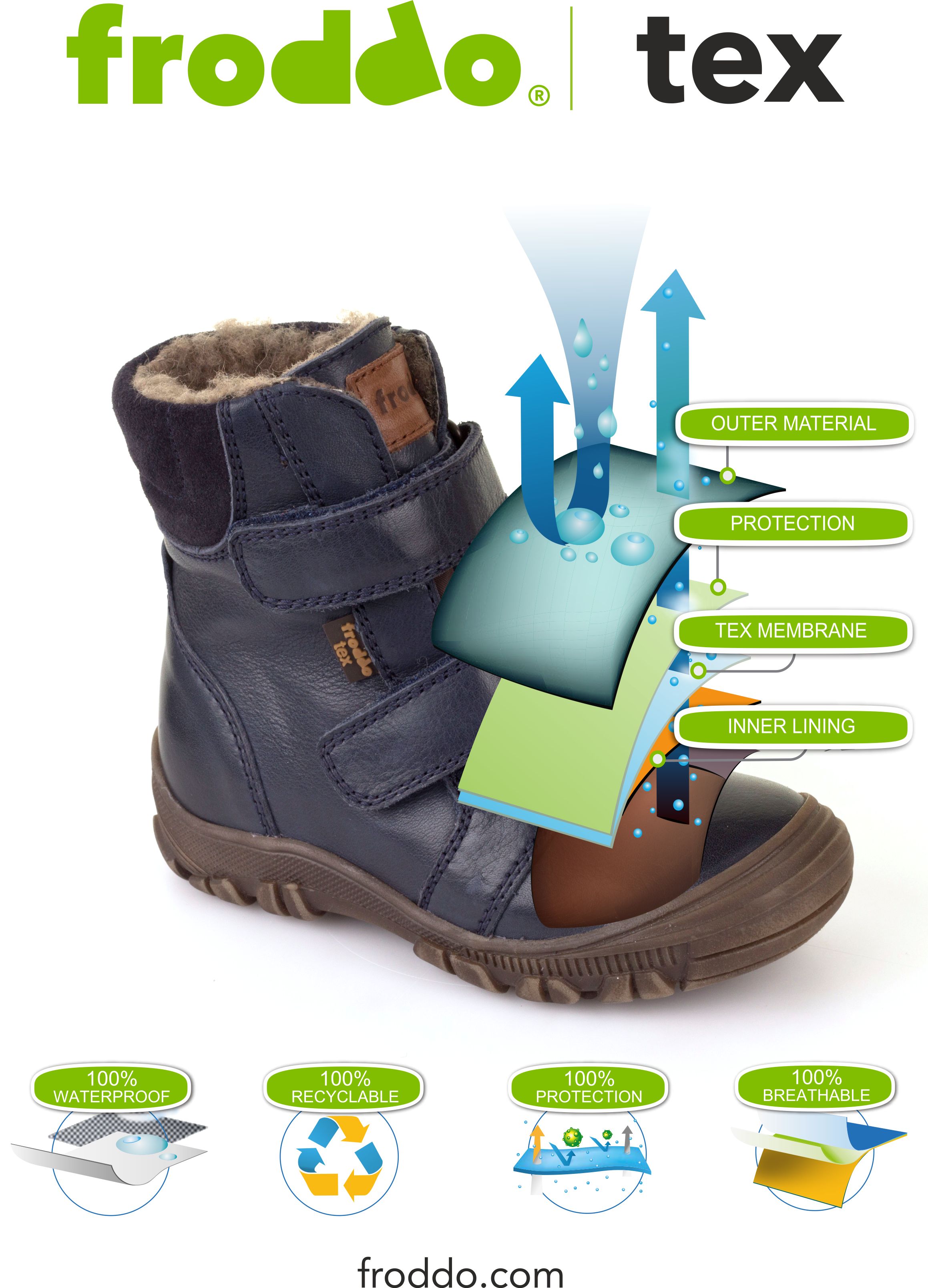 Froddo hat eine spezielle FroddoTex Linie von Schuhen, Stiefeln und Knöchel für die kältesten Tage des Jahres vorbereitet, so dass die Kinder die Freuden des Winters in einem warmen, trockenen, luftig und bequem genießen zu tragen. Die moderne Herstellungsverfahren, natürliche Materialien, wasserdicht und atmungsaktive Membran bietet den besten Schutz ihre Füße im kalten Regen- und Schneetage. Wasserdicht tex Membran abweist Feuchtigkeit von außen, eine atmungsaktive Schicht, die die Innenseite absorbiert, verringert das Schwitzen der Füße und verhindert den Wachstum von Bakterien. Linie Gezeichnet mit echten Pelz oder Wolle wird auch den kältesten Winter wärmen