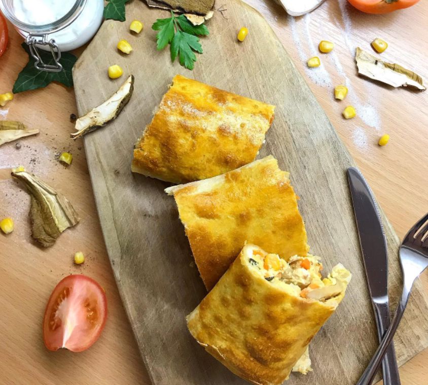 Gemüsegebäck - "Gemüse-Strudel" wird von allen geliebt, und die Kombination der Füllung wird immer an den Inhalt Ihres Kühlschranks angepasst. Den Teig ausrollen und mit Gemüse nach Wahl belegen. Die beste Kombination sind geschmorte Karotten, Zucchini und Spinat, in die Sie Käse reiben, ein Ei hinzufügen und alles miteinander vermischen können. Den Strudel vor dem Servieren gut abkühlen und in kleine Stücke schneiden, um Kindern das Essen zu erleichtern.