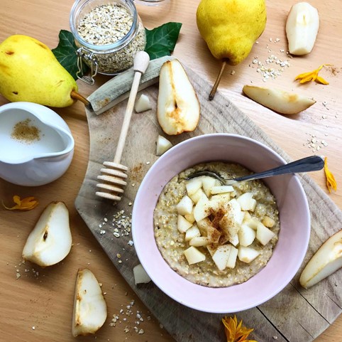 Put the rice milk into the bowls and pour in the oatmeal. Cook on the medium heat for 8 to 10 minutes until the porridge becomes creamy. Cut the pears into the cubes and mix it with the porridge. Additionally sweeten with honey and cinnamon. Serve warm.