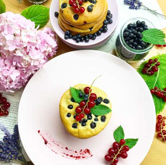 Separate the egg (the yolk and the white) and mix the egg white into stiff peaks. Beat the egg yolks until foamy with a pinch of salt and honey and gradually add the the dry ingredients and milk. If the mixture gets too thick, you can add a little more milk. If you don't like cow's milk, you can use any other. In the end mix a ripe banana and add a vanilla flavoring. Stir in the egg white with the light movements so that the pancakes will be airy. The mixture must be thick, but not too thick so you could shape the small pancakes. Put a baking paper on a baking sheet and use a spoon to form small round pancakes and press the blueberries into it. Place 3 – 4 blueberries into each mini pancake. Bake it at the temperature of 160 °C until you notice the pancakes have risen and taken on a nice golden yellow color. Serve with agave syrup or honey. The unit of measurement is a larger teacup.