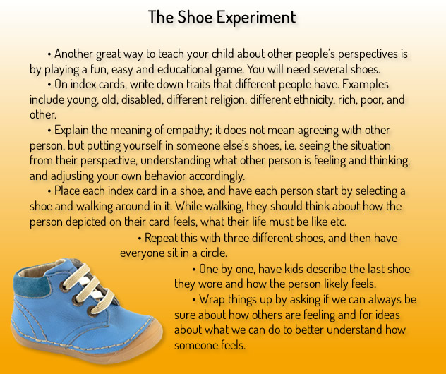 It’s not easy to understand other people’s feelings when you view them as “others.” Empathy is all about having the ability to step into other people’s shoes. There’s more to it than that, though. It’s also about responding constructively and appropriately to the way others are feeling. One way to teach this is by pointing out characters in TV shows, movies and books and asking your child how they are probably feeling.