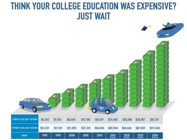 Tuition can vary widely according to the type of school. Some areas offer subsidized tuition to residents, but your kids may want to attend a college that has a wider variety of course offerings. Tuition is just one of the costs you should be taking into consideration. If your teen is set on going away to college, room and board make up a large portion of the total costs of an education.