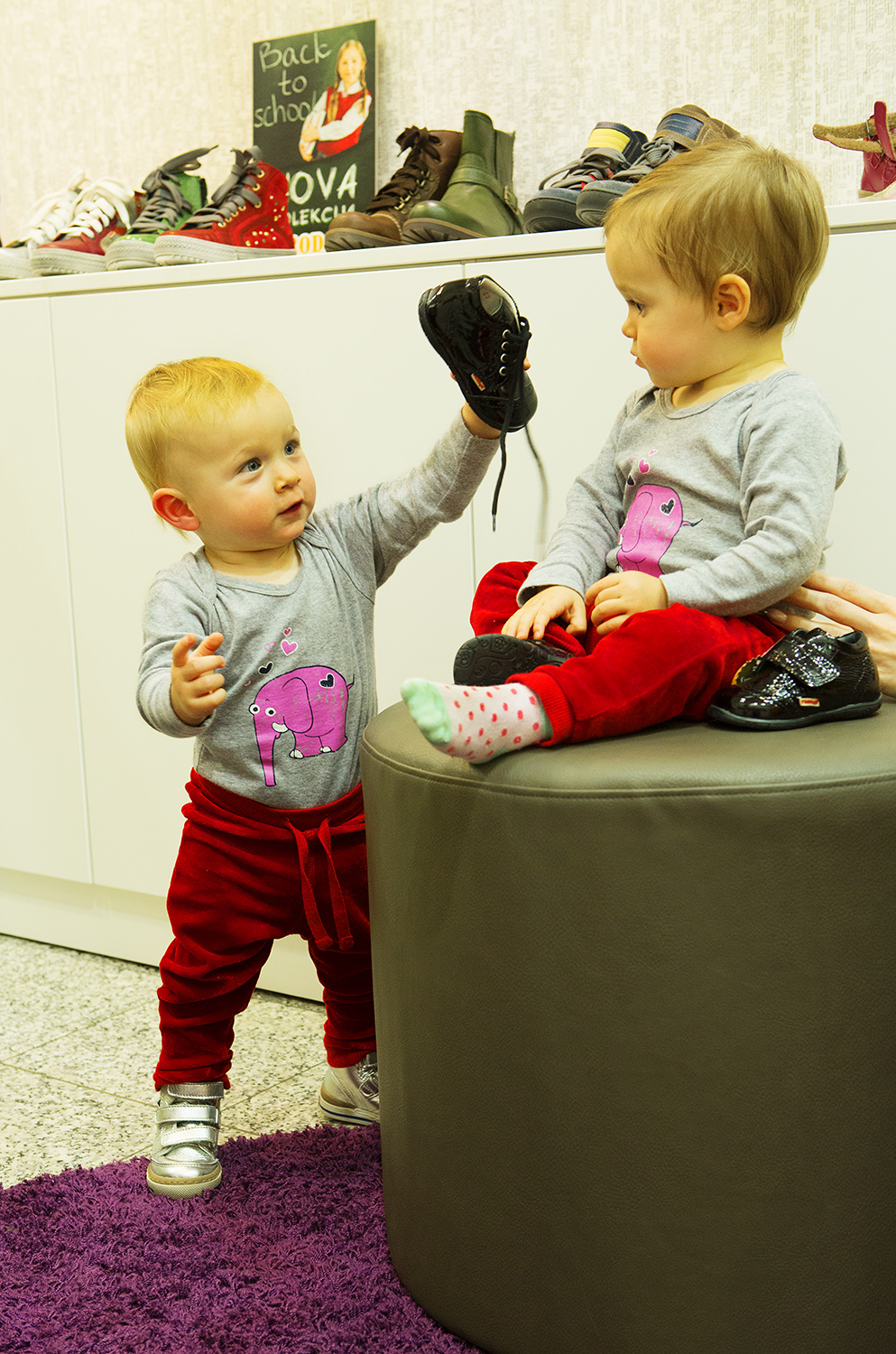 Nemojte se preplašiti ako prva djetetova reakcija na cipele bude kao da ste mu na noge stavili utege od deset tona. Tia i Zoe su isprva odbijale da ih se postavi na noge - sjedile su u čudu promatrajući cipele na stopalima, dizale i spuštale noge. No, ubrzo su se uhvatile najbližeg oslonca, prokrstarile dućanom trudeći se prikupiti sve izložene modele i konačno pokazale da su cipele, unatoč našim objašnjenjima 'to se ne jede', za njih jedan novi, zgodan obrok.
