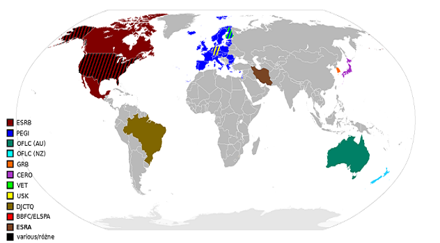 "Video game rating systems map" by Selecting and filling of the countries: Holek (talk · contribs) - based on Image:BlankMap-World6.svg.Licensed under CC BY-SA 2.5 pl via Wikimedia Commons